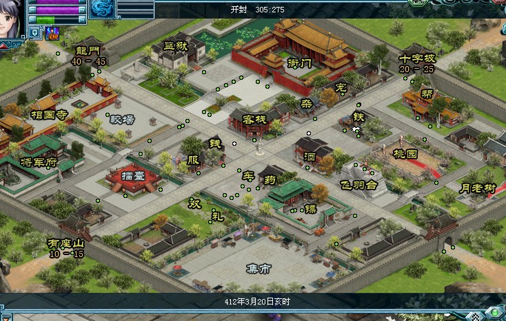 键盘上按“Tab”键调出地图,可以点击开封城内的任何地方,自动寻路系统就会带你到那里去。建筑上标注着名称简写,看个名字也就知道个十有八九啦,有兴趣的话还可以来回逛一逛!把开封城的几大功能区记好用会,这是游戏顺利的大本营!