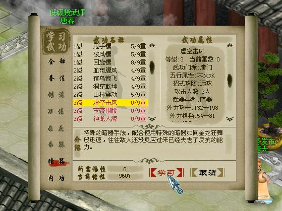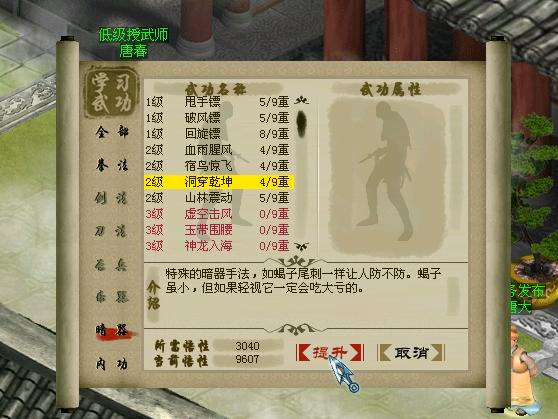 3 学会某个招式后,再点该招式,点击对话框下面的“提升”,扣除所需的悟性值后,这招式就会增加一重。在学习下一个招式前,必须至少将前一招修够一重。