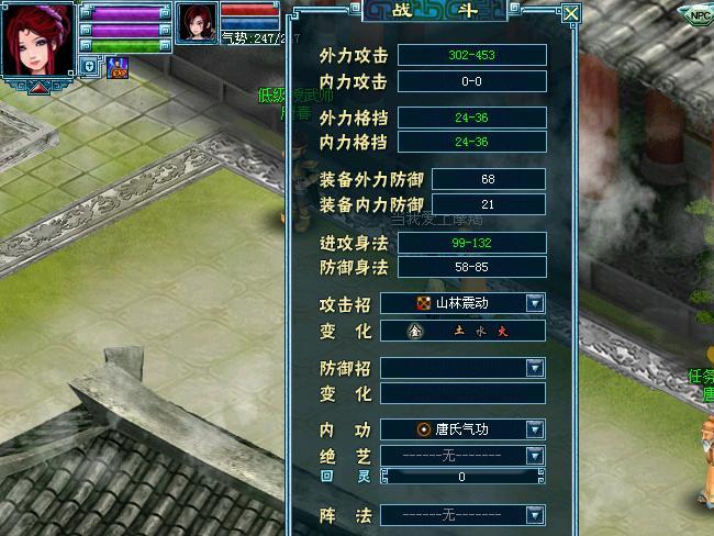 玩家可以点开“武功”栏(“Alt+W”),这时会弹出武功面板,武功栏详细地列出了玩家当前的攻击与防御,在这里玩家可以查找和变更自身武学招式技能。